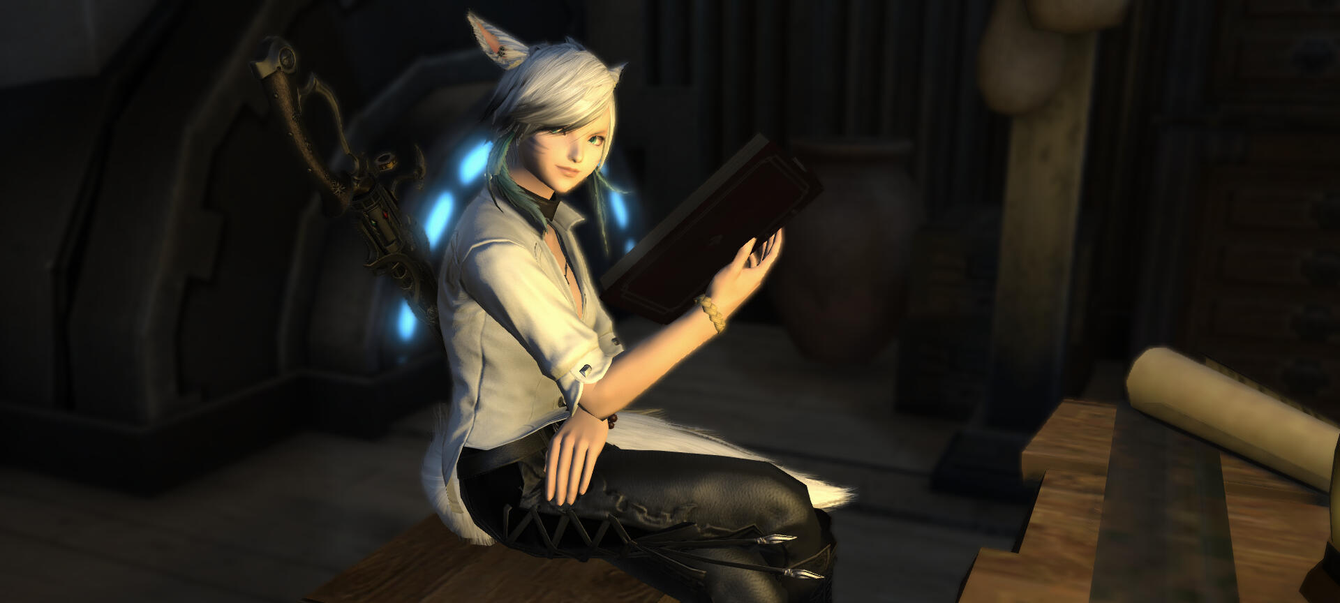 Most of the group thrown into the Voidgate that fateful day knew nothing of what to expect on the other side except to never be seen or heard from again, though by either sheer luck or divine intervention, among them was a member of the Allagan Imperial Family vying for the throne and knew all to well what awaited them. He hatched a plan with his supporters to harness the power of the Void to his own ends. What he found however, was a neverending maelstrom of chaotic Astral aether that threatened to rip them apart. Most of their preparations were rendered useless, but thanks to the inginuity of Alus and other rebel leaders, they were able to modify an Aetheric Converter to project a field of stable aether in which to exist without fear of succumbing to aetheric imbalance and turning into a Voidsent.The process used a substance called Myrrh as the fuel, which was gathered by breaking down anything they could fine that hadn't been tainted by the Void. Gathering such things became the most important task for their continued survival, leading to the establishment of Aether Hunters. These Hunters sought out Voidgates being opened from other places and taking anything they could use to turn to Myrrh, even occasionally finding able bodied people who could bolster their ranks. Through this, they were able to sustain themselves for generations, though one would not easily call such an existence a life well lived.Eventually there was a noteworthy Miqo'te Hunter born into that world, he was proud to continually serve his tribe and faithfully sought out and recovered salvage from opened Voidgates, but he would always lament when things like books or works or art were converted into Myrrh. Eventually he would start to gather extra so he could hide any books he recovered in secret. This went well and emboldened him to seek more and more until he came across an old Mhachi historian. Normally, those that were too enfeebled to become Hunters placed too great a burden on the tribe and had to be Spared, their own aether converted into Myrrh as their final gift to the tribe. He felt that turning the historian over would be too great a loss, as this man could teach them about the world their ancestors left behind. He worked hard to provide extra Myrrh in secret to feed his old friend, and in return he was taught to read Allagan and Mhachi, which allowed him to finally read all the books he'd collected.Eventually the fatigue and lost sleep took their toll on his abilities as an Aether Hunter, and he was found out by a fellow Hunter, a remarkably talented lady Miqo'te who considered him something of a rival. She was at first shocked by his apparent selfishness but over time he was able to convince her that what he was doing would ultimately make everyone better off. From that day forward, she found new hope and purpose and pledged to help him. They more often than not found themselves hunting together after that.