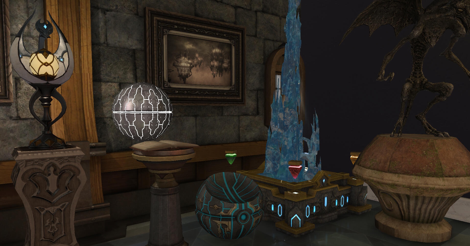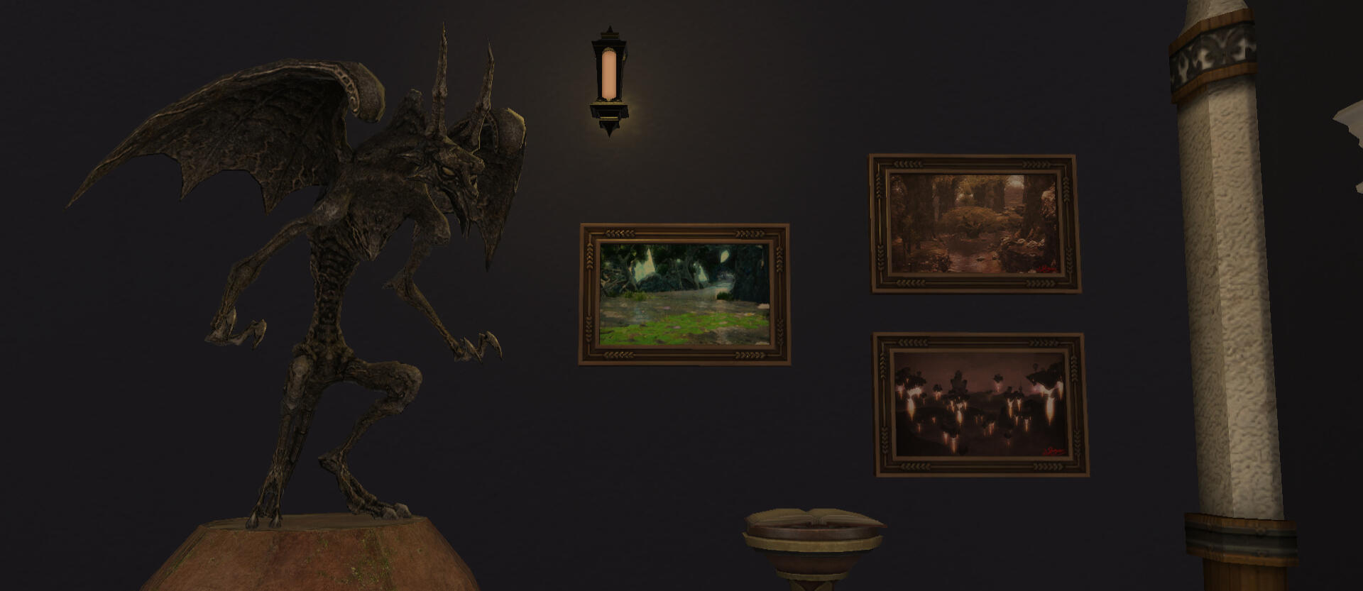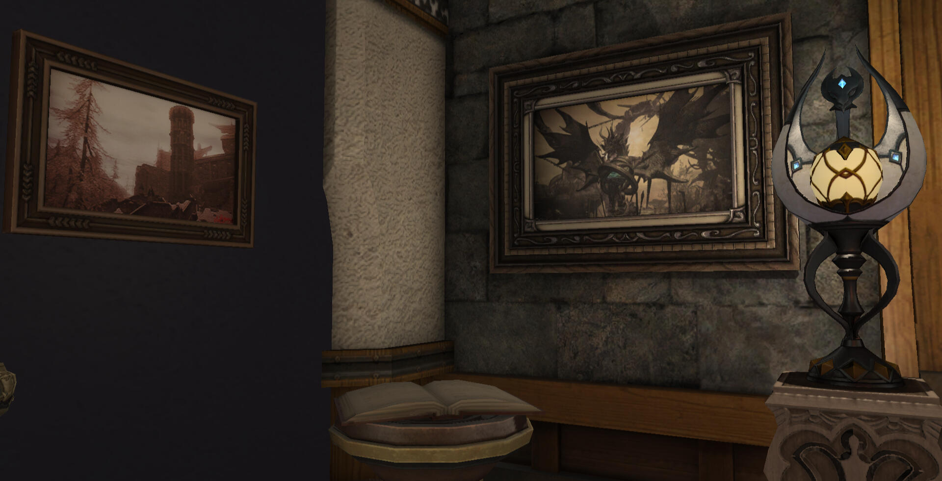 The New Saronia Embassy's main level contains a reception desk with a small collection of restored Allagan nodes, seating area with a selection of tomes containing collected works from the Third Astral Era, and a small museum with exhibits of cultural significance to Saronia's history. Behind the main lobby is a door leading to a variety of spaces open to the public. Downstairs is a lounge used in our Public Nights ((Wednesdays 4:30pm Pacific/7:30pm Eastern)) that serves to offer a place to socialize, relax, and occasionally find entertainment. Upstairs is our administrative office, conference room, and storage room for our Logistics department.